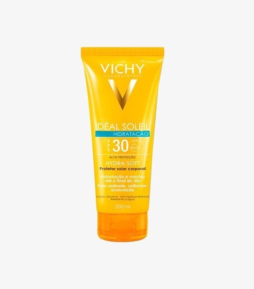 Com textura leve e de rápida absorção, Idéal Soleil Hydrasoft não deixa resíduos brancos na pele e possui ativos hidratantes como a glicerina e vitamine E que garantem uma pele macia e aveludada e é enriquecido com água termal mineralizante de Vichy.
